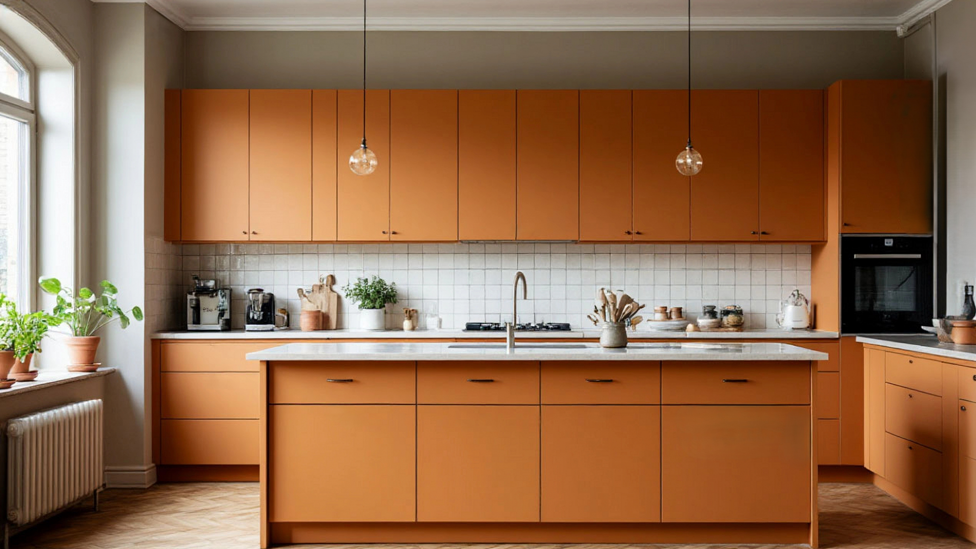 Матовая эмаль, выбранная в качестве основного покрытия, выгодно выделяет кухню не только визуально, но и функционально. Она устойчива к воздействию воды, бытовой химии, пара, легко очищается и сохраняет эстетичный вид долгие годы. Темно-оранжевый оттенок при этом остаётся таким же насыщенным, ровным и глубоко матовым, не выцветает и не тускнеет со временем. Особенно приятным является и тот факт, что эмаль дарит фасадам ощущение монолитности: кухня выглядит так, будто создана из единого, ровного материала, где цвет и форма — единое целое.