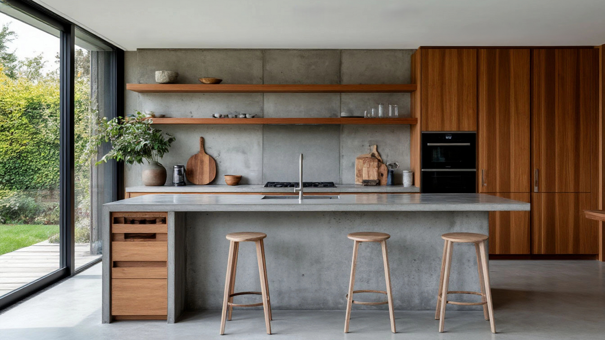 Боковые элементы под бетон продолжают общий архитектурный ритм. За счёт этого кухня выглядит цельной, собранной, монолитной — создаётся ощущение, что все детали составляют единый продуманный ансамбль. При этом тёплые оттенки под орех в фасадах, полках и шкафах делают пространство более живым и визуально тёплым, создавая баланс между индустриальным характером и домашним комфортом.