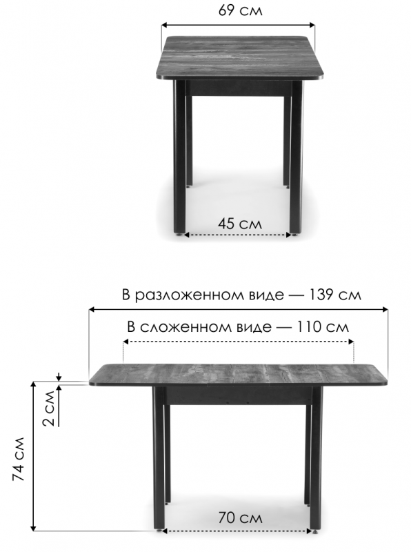Толщина столешницы: 2 см. Расстояние между ножками:  70 х 45 см.