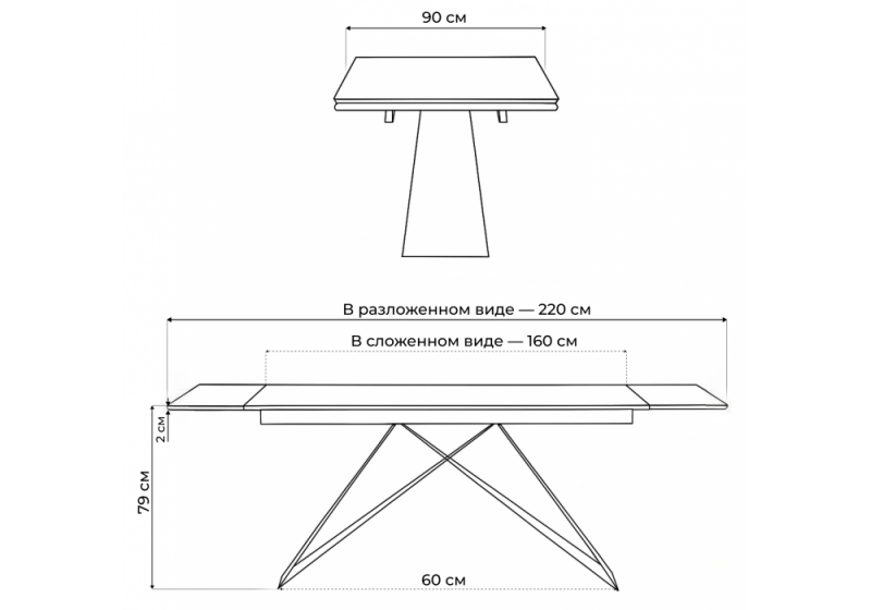 Расстояние между ножками: 60 см. Толщина столешницы: 2 см.