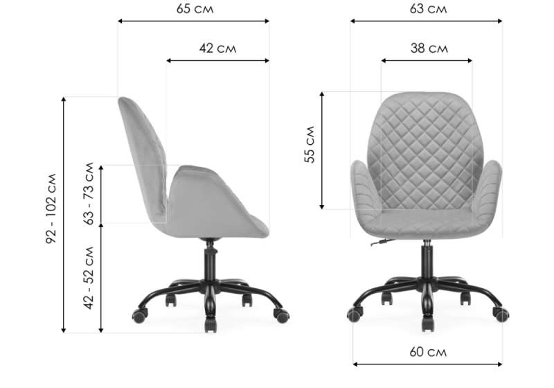 Высота подлокотников: 63 - 73 см. Высота спинки: 55 см. Диаметр крестовины: 60 см